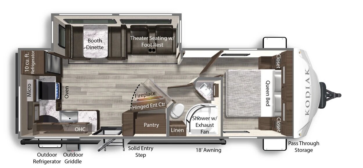 All the thrill of getting away combined with premium space and traditional comforts. That’s what a Queen-size bed brings to adventurers in every floorplan of our Kodiak Ultra-Lite travel trailers.
