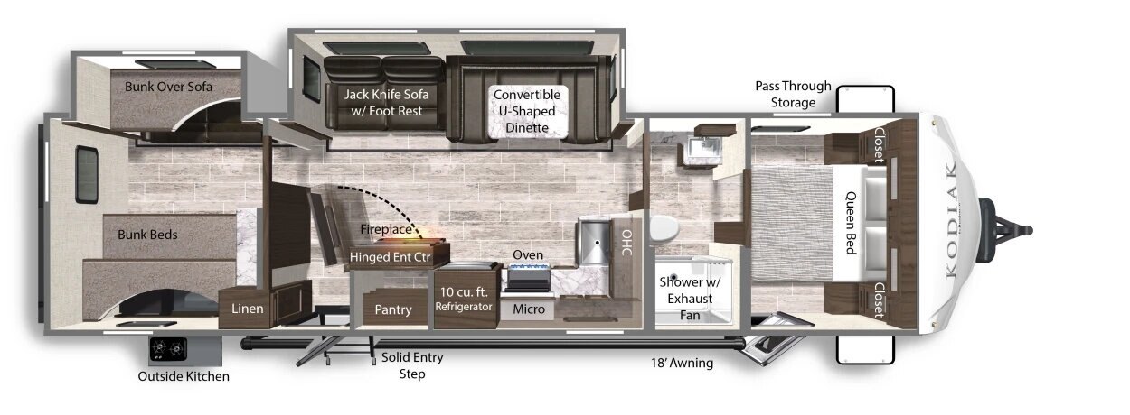 Take the scenic route with the Kodiak lineup. The leader in lightweight technology with its aluminum super-structure design, be comfortable wherever you roam. With units light enough to be towed by most SUV’s, minivans, crossovers, and light trucks, we’re sure to have the model that best fits your camping needs.