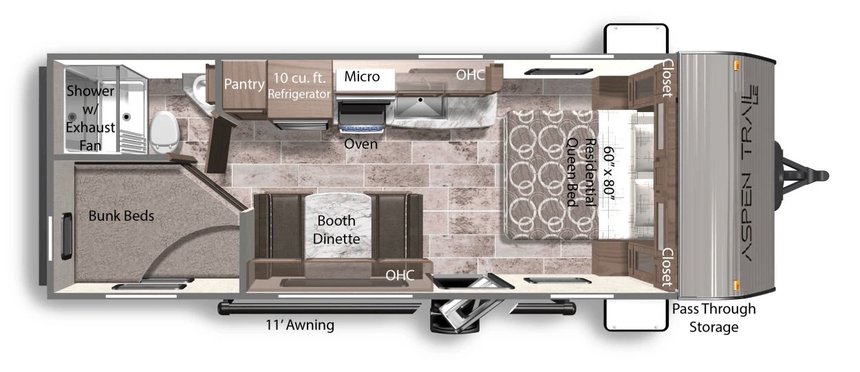 Front/Rear Power Stabilzer Jacks Power Awning with LED Lights Battery Disconnect Switch Magnetic Baggage Door Catches Black Tank Flush 15,000 BTU AC (Slide Models) 30 Amp Power Cord Solar Spirit II Package- Aspen Trail WEST Coast Only - 100W Panel, 10 Amp Controller, Side Port Power Tongue Jack Friction Hinge Entry Door Solar Spirit I Package - Side Port, Roof Port, Controller Prep, Inverter Prep Spare Tire 60,000 BTU Tankless On Demand Water Heater High Output Furnace 35 Amp Converter Back Up Camera Prep
