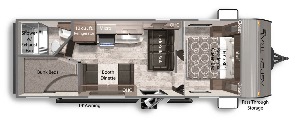 Front/Rear Power Stabilzer Jacks Power Awning with LED Lights Battery Disconnect Switch Magnetic Baggage Door Catches Black Tank Flush 15,000 BTU AC (Slide Models) 30 Amp Power Cord Solar Spirit II Package- Aspen Trail WEST Coast Only - 100W Panel, 10 Amp Controller, Side Port Power Tongue Jack Friction Hinge Entry Door Solar Spirit I Package - Side Port, Roof Port, Controller Prep, Inverter Prep Spare Tire 60,000 BTU Tankless On Demand Water Heater High Output Furnace 35 Amp Converter Back Up Camera Prep