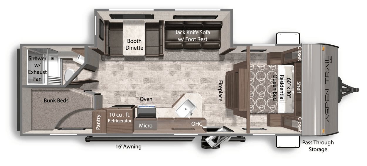Front/Rear Power Stabilzer Jacks Power Awning with LED Lights Battery Disconnect Switch Magnetic Baggage Door Catches Black Tank Flush 15,000 BTU AC (Slide Models) 30 Amp Power Cord Solar Spirit II Package- Aspen Trail WEST Coast Only - 100W Panel, 10 Amp Controller, Side Port Power Tongue Jack Friction Hinge Entry Door Solar Spirit I Package - Side Port, Roof Port, Controller Prep, Inverter Prep Spare Tire 60,000 BTU Tankless On Demand Water Heater High Output Furnace 35 Amp Converter Back Up Camera Prep