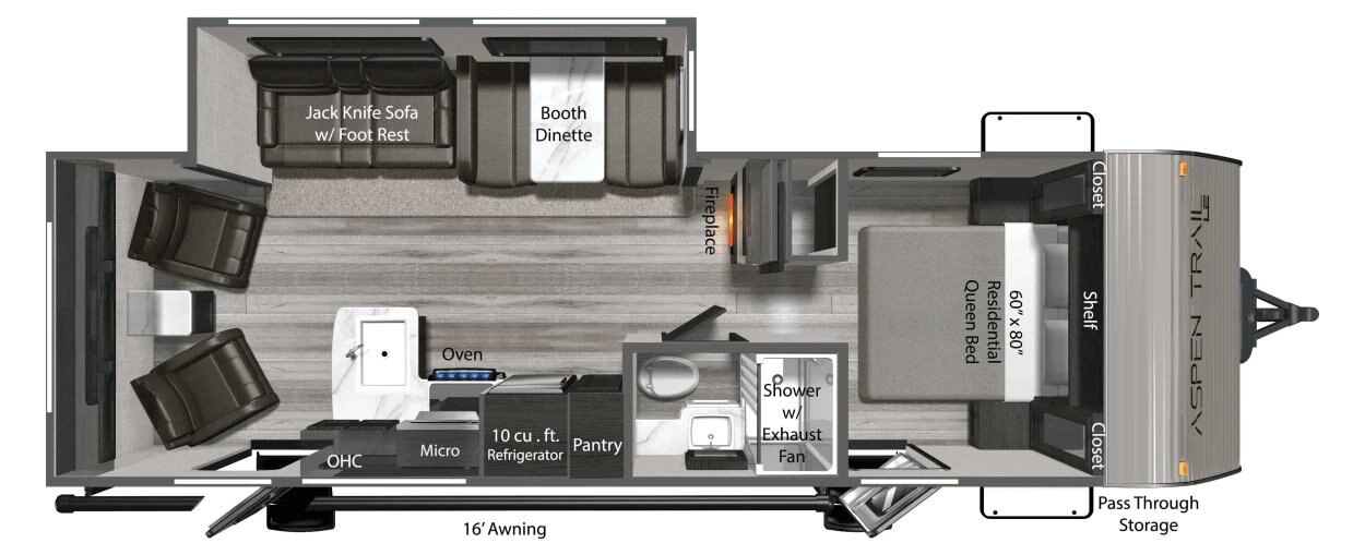 Front/Rear Power Stabilzer Jacks Power Awning with LED Lights Battery Disconnect Switch Magnetic Baggage Door Catches Black Tank Flush 15,000 BTU AC (Slide Models) 30 Amp Power Cord Solar Spirit II Package- Aspen Trail WEST Coast Only - 100W Panel, 10 Amp Controller, Side Port Power Tongue Jack Friction Hinge Entry Door Solar Spirit I Package - Side Port, Roof Port, Controller Prep, Inverter Prep Spare Tire 60,000 BTU Tankless On Demand Water Heater High Output Furnace 35 Amp Converter Back Up Camera Prep