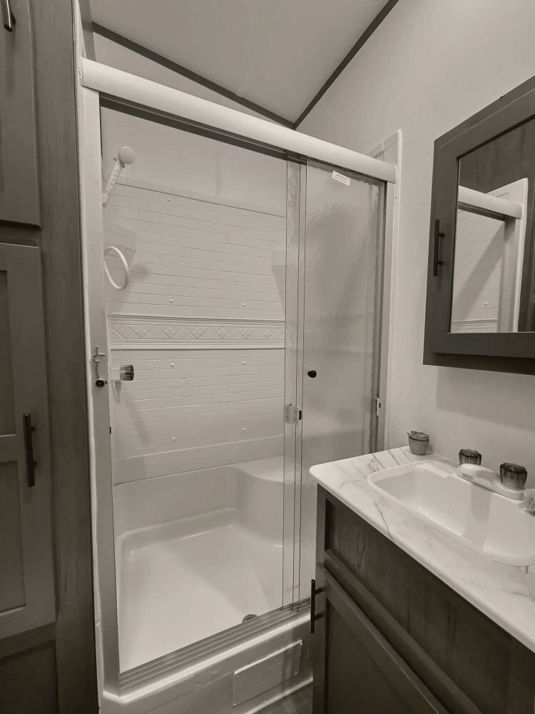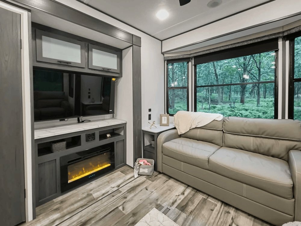 Standard Interior Window Valance Package Comfortable Tri Fold Sofa Bay Front on All Models Large Dresser Drawers Bathroom Exhaust Fan Full Extension Ball Bearing Drawer Guides Large Double Door Residential Refrigerator Floating 30" LED Fireplace with Heat HD LED Television Beauflor Upgraded Flooring Everdream King Mattress Flush Floor Slide Out - No Carpet 8 Ft. Ceiling Throughout (7 Ft. Slide-Out Height) Seamless Countertops Residential Sized 24" Oven w/ 3 Burner Cooktop and Glass Cover Residential Sized Microwave Washer/Dryer Prep Home Series Interior Design Package Aspen Trail Command Center Plush Recliners (Per Model) Ceiling Fan in Living Room (Most Models) Large Walk in Shower w/ Bench Seat 3 Piece Glass Shower Door Enclosure Medicine Cabinet Entertainment Center w/ AM/FM/Bluetooth Stereo Sliding Patio Door (Main Entry) Table & Chairs Upgraded Furniture Package featuring Thomas Payne Satellite/Cable Hook Up Large Dresser with Drawers in Bedroom Blackout Roller Shades Throughout Kitchen Backsplash High Rise Faucet w/ Large Kitchen Sink Range Hood w/Exhaust Fan & Light Full Extension Drawer Guides Maple Cabinet Doors & Drawers Central Vacuum System