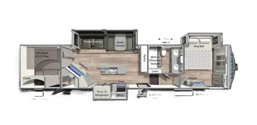 Astoria Fifth Wheels are designed for those who refuse to compromise on comfort or quality while exploring the open road. Every detail reflects a commitment to premium living, from the modern interiors and upscale finishes to innovative construction that stands the test of time. Built with advanced composite floor technology for lasting durability and lighter weight, Astoria delivers a solid foundation for every adventure. Inside, you’ll find residential-inspired features—spacious layouts, high-end appliances, and refined design touches—that make life on the road feel just like home, only with a better view.