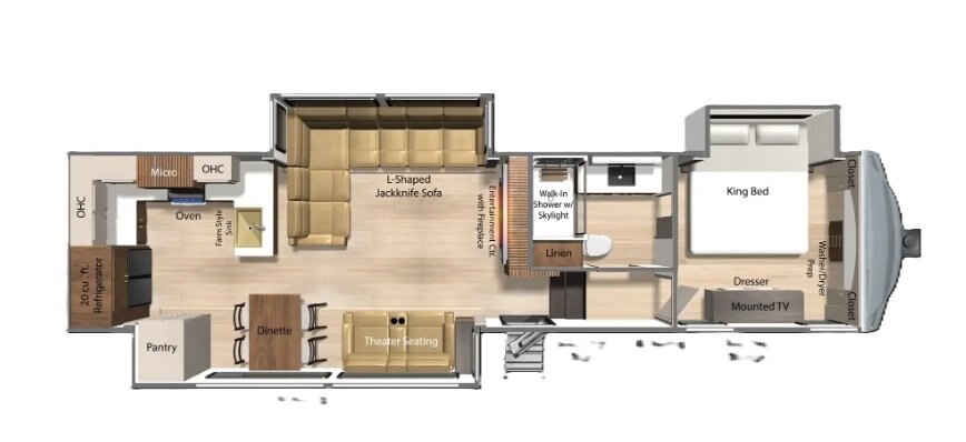 Ultra Bright Flush Mounted LED Interior Lights Residential and Convertible Sectional Sofa Solid Surface Kitchen and Bathroom Tops Large Kitchen Porcelain Sink High Rise Kitchen Faucet with Integrated Pull- Out Sprayer Pop-Up Receptacles in Kitchen and Dinette Areas Bedroom USB Charging Station 20 cu ft, 12V Residential Refrigerator GE 30" Over-the-Range Microwave 24" Furrion Stove with Stainless Steel Drawer Custom Wardrobe Door System 65" HD LED Smart TV in Living Room 40" LED TV in Bedroom Entertainment Center Soundbar Blade Ducting System All Custom Cabinetry Fluted Range Hood, Soffit Lighting, and Entertainment Centers Magnetic Bedroom Door Holder 35,000 BTU Furnace 5,000 BTU Electric Fireplace Multiple Fantastic Vent Fans Washer / Dryer Prep Residential Kitchen and Dinette Lighting Master Bedroom Reading Lights LED Motion Sensor Closet Rods