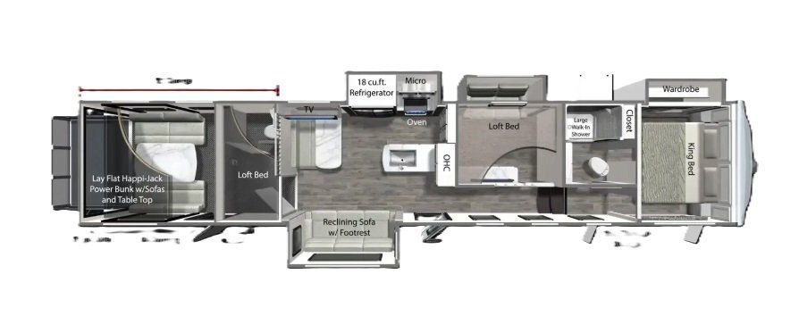 The Voltage Triton is a spacious and well-equipped toy hauler, perfect for adventure seekers and families alike. Its unique floorplans feature multiple interior seating points and expanded sleeping areas for extra travelers, including a mid-bunk loft, ensuring everyone is comfortably accommodated. Modern amenities such as a 20 cu. ft. refrigerator, a generous walk-in shower, and a king-sized bed make it an ideal choice for those looking to blend luxury with outdoor fun. Discover the endless possibilities of RV living with the Voltage Triton.