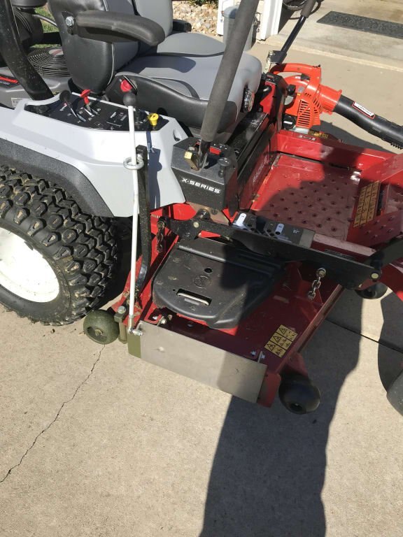 A tools-free removable foot rest eases access to the top-side of the cutting deck, and tool-less removable belt shields provide easier access to belts and spindles. A welded jack receiver on the Radius frame allows for easier service to the bottom-side of the deck when combined with the optional jack. |