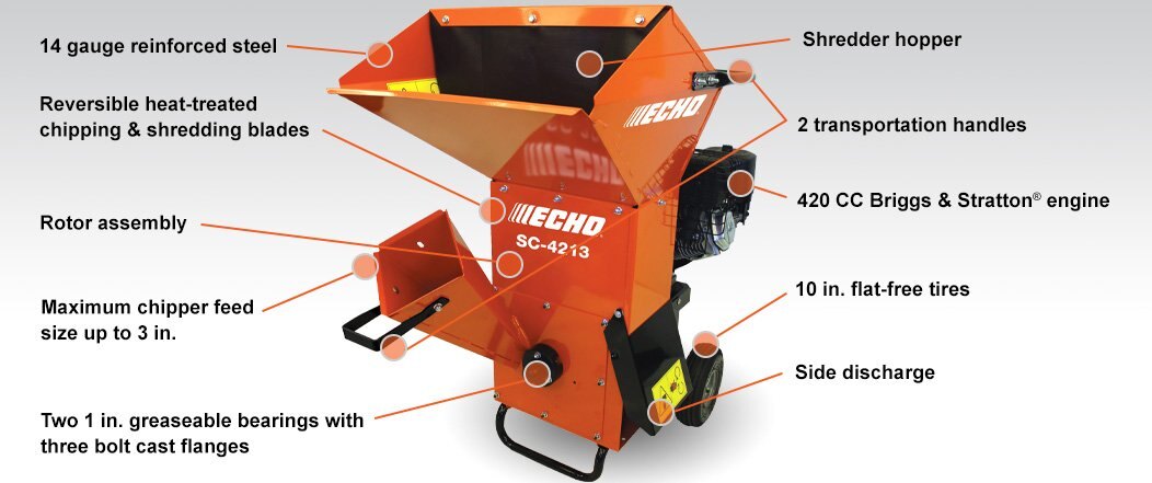 CHIP IT. SHRED IT. MULCH IT. Light weight material, garden waste or branches up to 3 inches in diameter are no problem for ECHO’s SC-4213. This chipper/shredder can chop up debris into fine chips that are great for composting, mulching or reducing the number of bags for yard waste. |