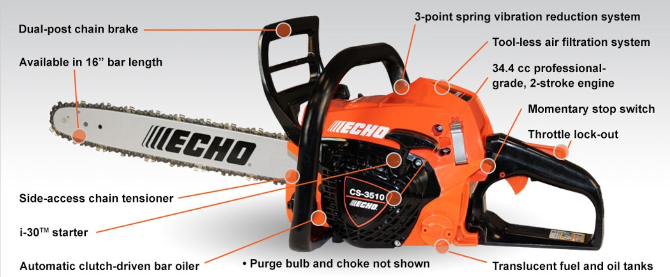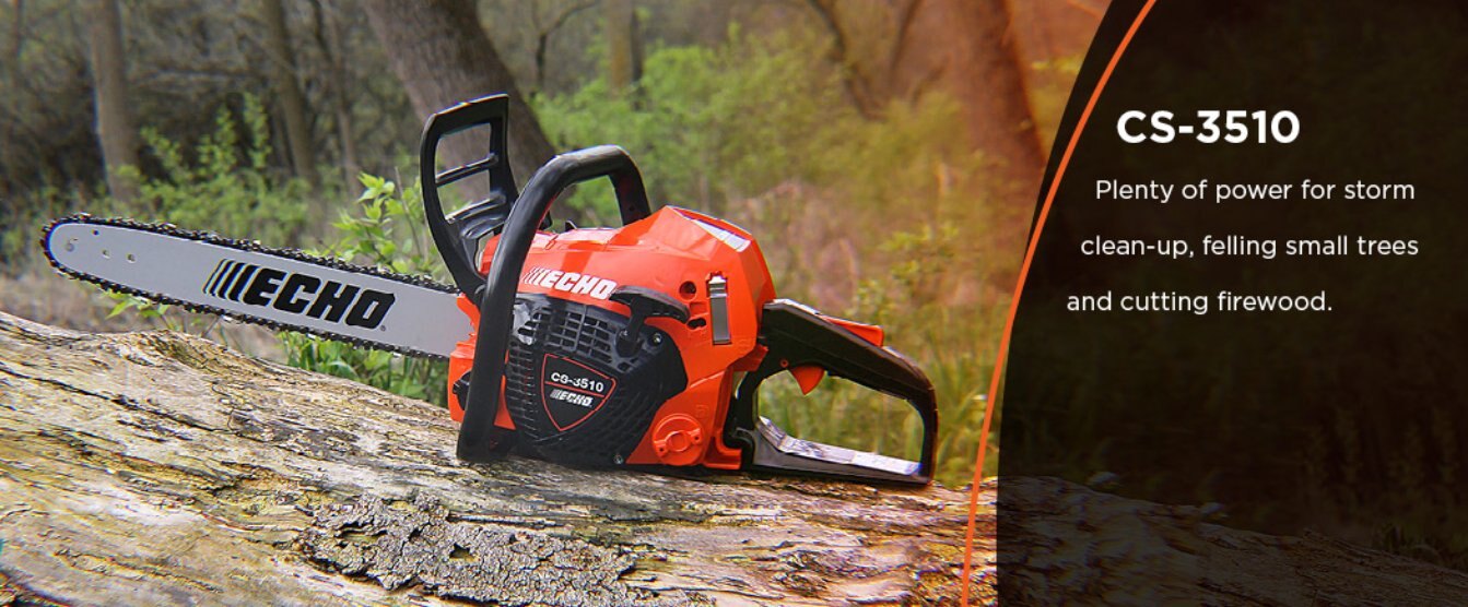 ECHO’s CS-3510 puts awesome power in your hands. It’s ideal for storm clean-up, light firewood cutting, light limb trimming and felling trees up to 28 inches in diameter. It’s lighter and has more power for its size bringing greater productivity and less fatigue for the user.