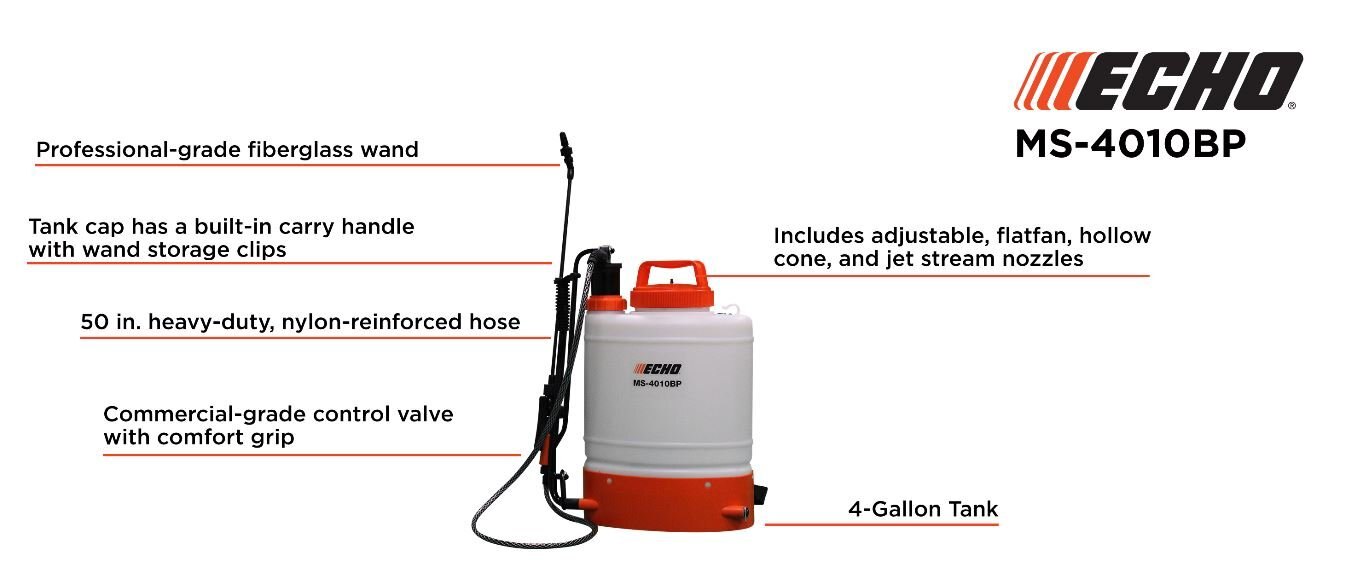 ECHO is Proud to Introduce our New Lineup of Manual SprayersOur new ECHO lineup of Manual Sprayers allows you to distribute fertilizers, pesticides, and herbicides quickly and accurately. ECHO's Manual Sprayers are equipped with either piston or diaphragm pumps and are designed for commercial use. Featuring a professional shut-off valve with comfortable grip; and easy-to-clean in-line filters, ECHO's Manual Sprayers are built for heavy day-to-day use. All ECHO Manual Sprayers are commercial-grade. From small gardens to medium to large-sized areas, ECHO offers the perfect solution for the everyday task for either professionals or homeowners. |
