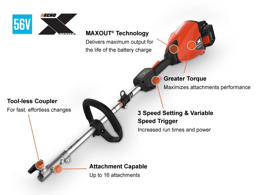 POWER THROUGH ALL-DAY EVERYTHINGPowerful brushless motor Provides gas-like performance Three speed settings To optimize cutting performance and extend battery life Gas-like torque For superior cutting performance Tool-less coupler and versatility Allows for fast easy changes on up to 16 different attachments Variable speed throttle Matches cutting conditions Rubber handle grips Same as those used on ECHO's gas trimmers MAXOUT® Technology Delivers maximum output until full battery discharge |