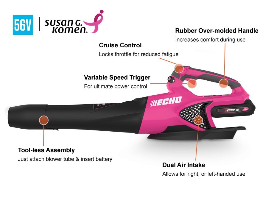 | The ECHO DPB-2500LE Limited Edition 56V Pink Blower is a powerful handheld leaf blower designed to support breast cancer research and awareness. Choosing the DPB-2500LE not only means getting a pro-grade leaf blower but also supporting a worthy cause, with a portion of proceeds going to breast cancer research and awareness. |