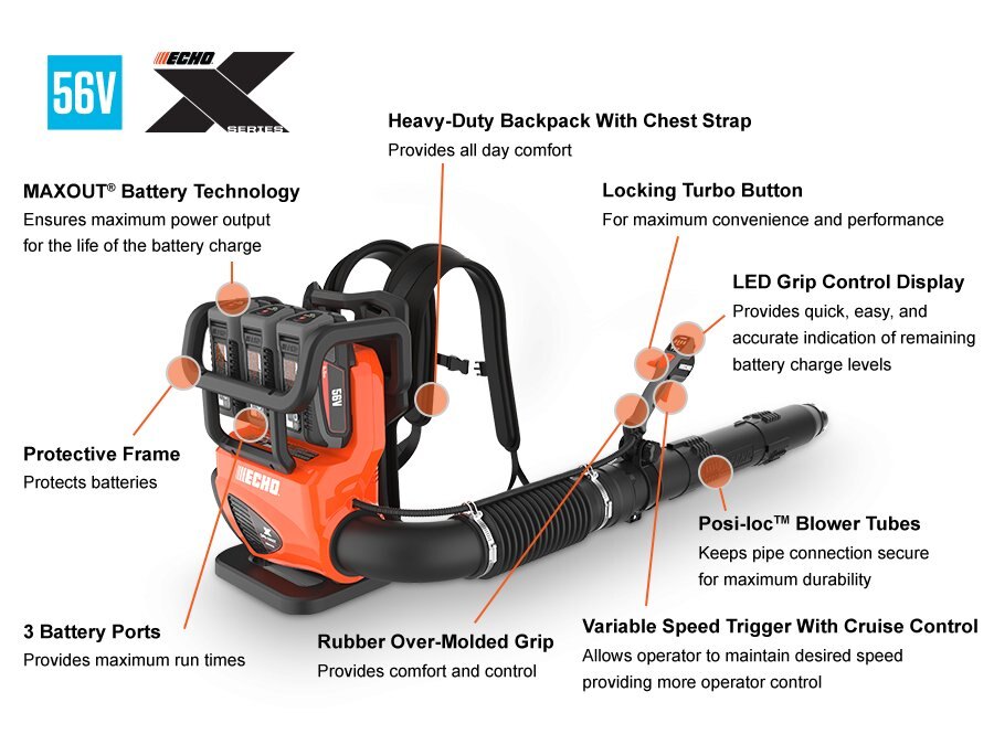 The DPB-5900T Backpack Blower offers 795 CFM at up to 195 MPH airflow, ideal for pros. It features MAXOUT® technology for consistent power, a unified battery platform for tool compatibility, and a triple battery port design for extended runtime. The LED grip display shows charge status and battery info.