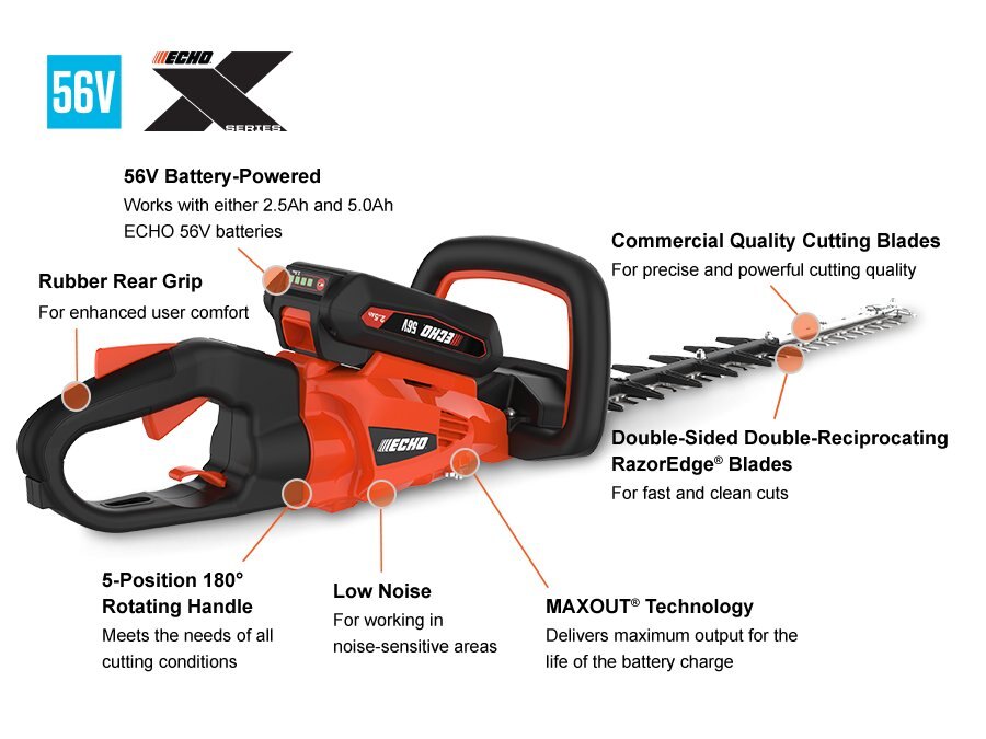 OPTIMUM BALANCE AND ERGONOMICS WITH 22 IN. DOUBLE-SIDED BLADESPowerful brushless motor Provides gas-like performance MAXOUT® Technology Delivers maximum power output for the life of the battery charge 4,600 blade strokes per minute Increases cutting ability 5-position, 180-degree rotating rear handle Increases maneuverability and provides operation orientation options Multiple speed settings For increased control while cutting and includes variable speed control at the "HIGH" setting Rubber grip rear handle Increases comfort and control 22 in. double-sided, double-reciprocating RazorEdge® blades Feature three sharpened edges for more efficient cutting Tip guard Protects gear case shock when encountering obstacles |