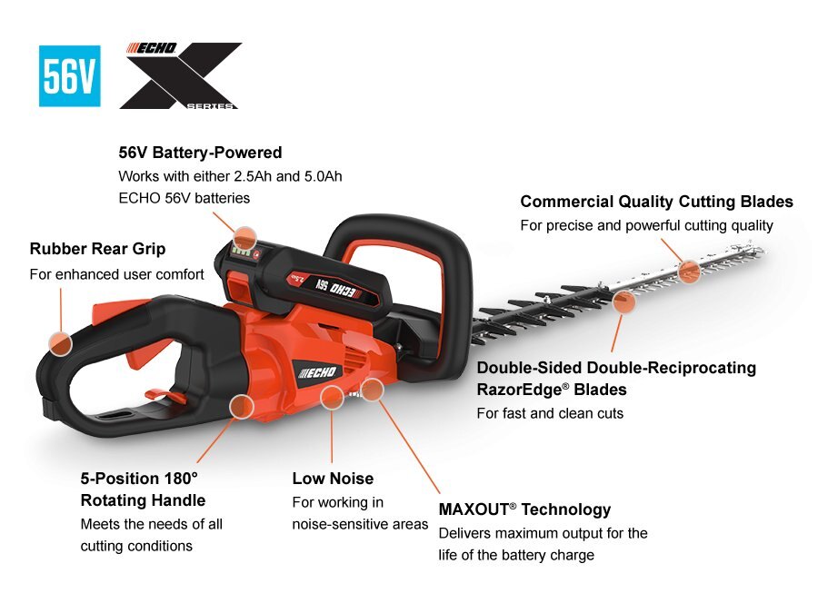 OPTIMUM BALANCE AND ERGONOMICS WITH 28 IN. DOUBLE-SIDED BLADESPowerful brushless motor Provides gas-like performance MAXOUT® Technology Delivers maximum power output for the life of the battery charge 4,600 blade strokes per minute Increases cutting ability 5-position, 180-degree rotating rear handle Increases maneuverability and provides operation orientation options Multiple speed settings For increased control while cutting and includes variable speed control at the "HIGH" setting Rubber grip rear handle Increases comfort and control 28 in. double-sided, double-reciprocating RazorEdge® blades Feature three sharpened edges for more efficient cutting Tip guard Protects gear case shock when encountering obstacles |