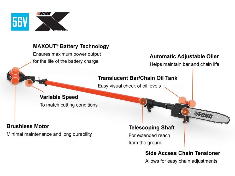 EXTENDED TELESCOPING REACH WITH BATTERY-POWERED CONVENIENCEPowerful Brushless motor Provides gas-like performance Automatic, adjustable oiler Matches the cutting conditions for reduced oil consumption Side-access chain tensioner Allows for easy chain adjustments Up to 16 ft. reach, and 20 ft. with optional 4 ft. extension Provides extended reach for easy limbing with your feet on the ground Variable-speed throttle Provides user control for cutting speed 10 in. bar and chain For smooth, efficient cutting MAXOUT® Technology Runs at full power until all the charge is fully drained Translucent bar/chain oil tank Easily visual check of oil levels |