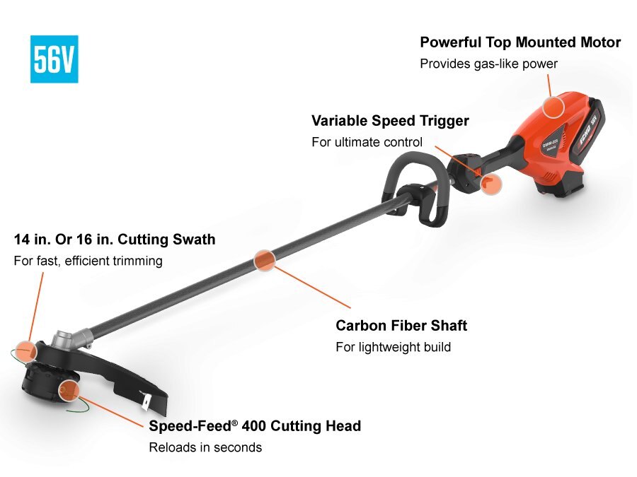 GAS-LIKE POWER WITH EASY LINE RELOADSPowerful top mounted motor Provides gas-like performance and balance 14 in. or 16 in. cutting swath Adjustable for either efficient or aggressive cutting Speed-Feed® 400 trimmer head Reloads in seconds without disassembly Lightweight with Carbon Fiber Shaft Hi/Lo speed settings To optimize cutting performance and extend battery life Cushioned handles Easy maneuverability and increase comfort |