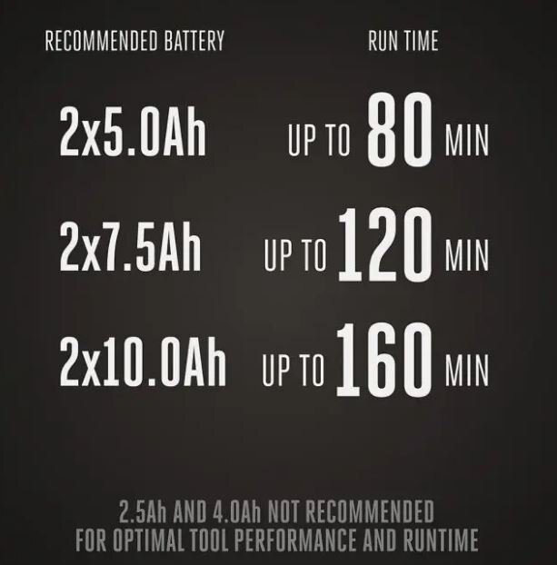 Up to 80 minutes of run time on single charge with two included 56V 5.0 Ah ARC Lithium™ batteries