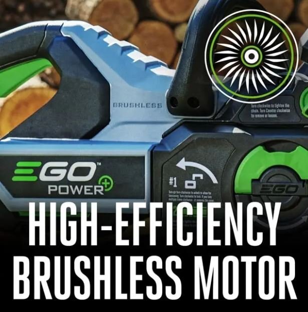 DETAILSThe new EGO POWER+ 16” Chainsaw delivers the power of gas without the noise, fuss, and fumes. This saw’s advanced, high-efficiency brushless motor delivers the equivalent power of a 40CC gas chainsaw that lasts up 130 cuts on a 4x4 (when used with the EGO 2.5Ah 56V ARC Lithium™ battery). The tool-less chain tensioning system allows for fast and easy bar and chain adjustments through independent dials, which are low profile in design and allow for cutting flush to the ground. The 20m/s chain speed allows for clean, efficient cutting and the automatic oiling system keeps the saw lubricated throughout the cutting application. For added control and safety, the saw is equipped with robust metal bucking spikes and kickback break with an easy to see brake position indicator. Experience Power Beyond Belief™ without the noise, fuss, or fumes. |