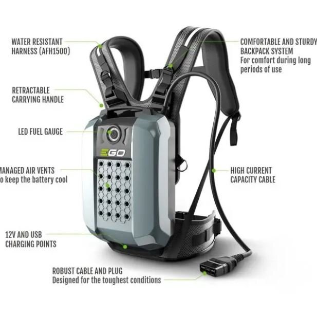 DETAILSThe EGO POWER+ Commercial Backpack Battery is designed to be used with the Commercial Series tools (LBX6000, STX3800, HTX6500) to provide professional grade power. Equipped with super-robust casing and rated IP65, this battery is designed to ensure durability and withstand the heaviest downpours to power through the challenges of professional use. Combined with industry leading run times, this sturdy and ergonomic is perfect for all day use. Experience Power Beyond Belief™ with the EGO POWER+ Commercial Backpack Battery. |