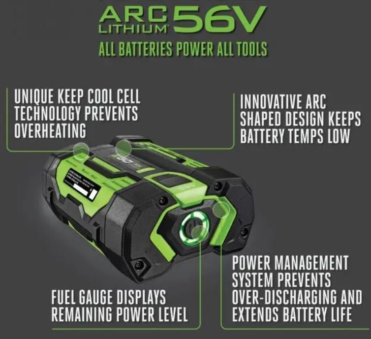 The EGO POWER+ 56-Volt 2.5Ah battery uses industry-leading ARC Lithium™ technology to deliver Power Beyond Belief™ and is compatible with all EGO outdoor power equipment. Keep-Cool battery technology keeps each cell cool for long life and work in the most extreme conditions.