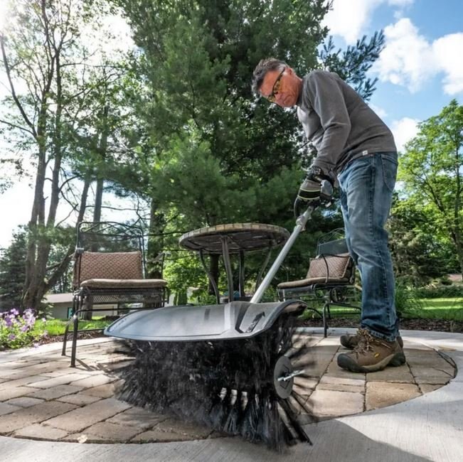 Removes debris like dust, dirt, leaves, snow, and rocks from hard surfaces