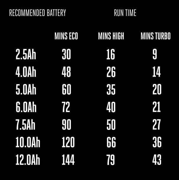 Runs up to 60 minutes on ECO, 30 minutes on high, 20 minutes on turbo with included 5.0Ah ARC Lithium™ battery