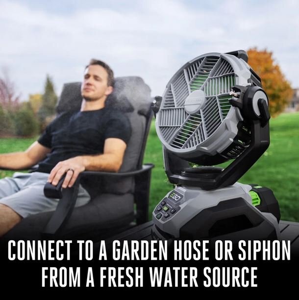 The EGO POWER+ 10” Oscillating Misting Fan packs powerful airflow into a compact size, delivering up to 1,700 CFM and up to 20 MPH air speed with three oscillation modes and three misting modes to deliver a truly customizable cooling experience. |