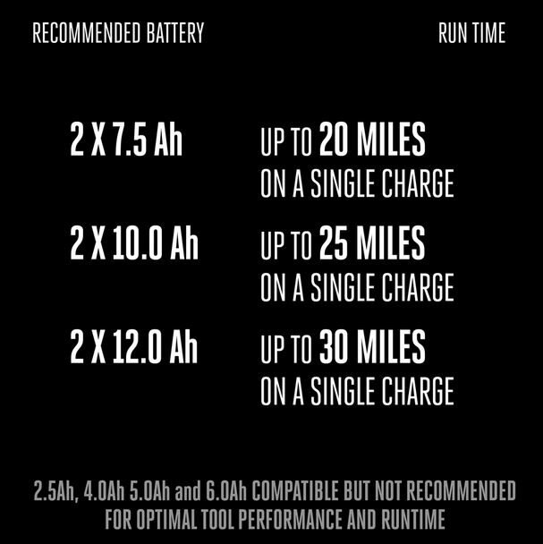 Uses PEAK POWER™ Technology to combine the power of two EGO POWER+ ARC Lithium™ batteries to deliver quiet acceleration with top speeds up to 28 MPH