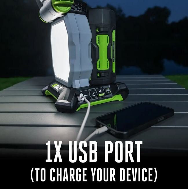 Details Introducing the EGO POWER+ Portable Area Light, the world’s most powerful area light in handheld cordless outdoor power. Illuminate any environment with 5 different brightness settings adjustable from 600-10,000 lumens. The POWER+ Portable Area light can be used as an ambient mood light, effective task light, and so much more. Activate boost mode for best in the class 10,000 lumens to illuminate large areas. With its compact design and integrated handle, easily store this light or take it on the go! Ideal for indoor and outdoor conditions with diffused panels for a softer light and weather resistant construction. This light is equipped with rafter hooks for hanging overhead and a tripod mount to cast light over an entire room. Get up to 35 hours of run time (on low with the recommended 5.0Ah ARC Lithium™ battery, available separately). Premium features like a USB A-Port come standard to make the experience unlike any other, allowing you to power or charge essential devices. Compatible with all EGO POWER+ ARC Lithium™ batteries (available separately) to deliver Power Beyond Belief™. |