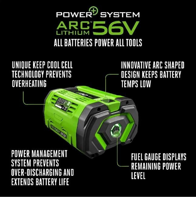 The EGO POWER+ 56-Volt 10.0Ah Battery uses industry-leading ARC Lithium™ technology to deliver Power Beyond Belief™ and is compatible with all EGO outdoor power equipment. |