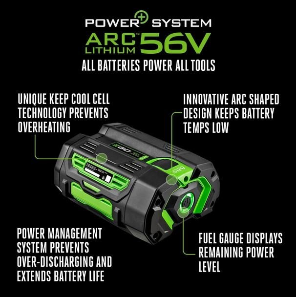 The EGO POWER+ 56-Volt 5.0Ah Battery uses industry-leading ARC Lithium™ technology to deliver Power Beyond Belief™ and is compatible with all EGO outdoor power equipment.