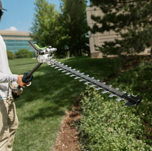 The EGO Commercial 21” Articulating Pole Hedge Trimmer features an industrial-strength carbon fiber shaft and rail along with an articulating head that rotates 135 degrees across 10 positions for ultimate control and precision. |