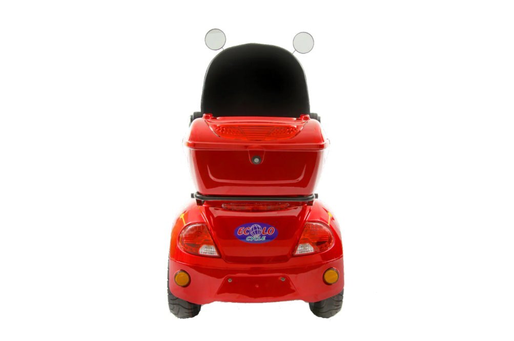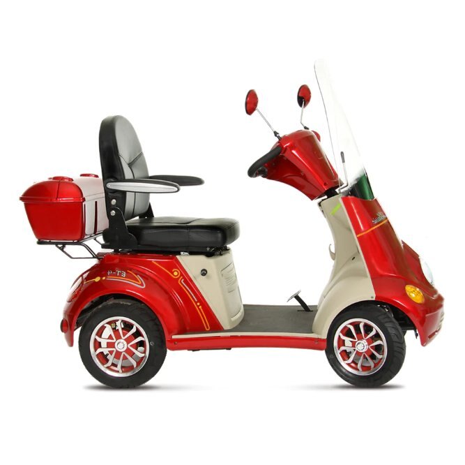 The Ecolo Cycle ET4 Classic is a premium 4-wheel mobility scooter designed for maximum comfort and convenience. With the optional roof canopy, it provides a perfect solution for all-weather mobility. Thanks to its rear-wheel drive with differential, it is easy to drive and maneuver in tight spaces. The 48V20Ah SLA battery offers a range of up to 50km, making it perfect for everyday use. The forward/reverse function allows for easy maneuvering, while the lockable rear box and under-seat storage provide secure storage for personal items. The front and rear suspension systems offer a smooth and comfortable ride, while the front hydraulic disk brake ensures reliable stopping power. The built-in alarm system also provides an added layer of security for peace of mind.