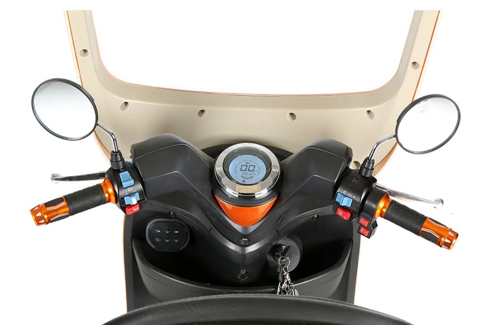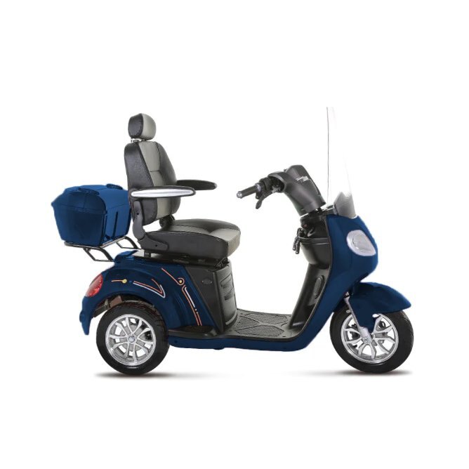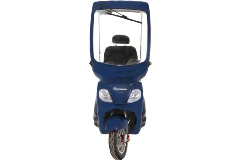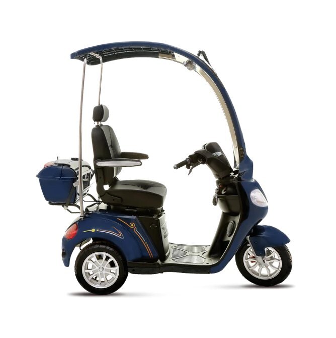 Introducing the Ecolo Cycle ET3 Commander Mobility Scooter. This 3-wheel mobility scooter comes with an optional roof canopy to keep you protected from the weather. Featuring rear-wheel drive with differential, a 60V20Ah SLA battery that offers a range of up to 50km, and a lockable rear box and under-seat storage, this scooter is perfect for running errands or commuting. With front and rear suspension and a front hydraulic disk brake, the ET3 Commander provides a smooth and comfortable ride. Plus, it also includes an MP3 player/FM radio system, making your ride even more enjoyable. Get the ultimate mobility experience with the Ecolo Cycle ET3 Commander Mobility Scooter!