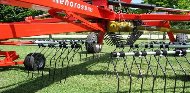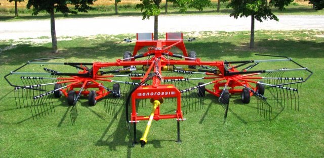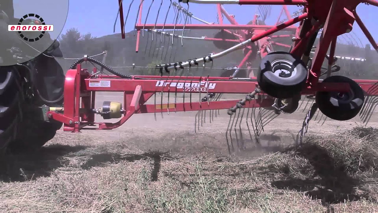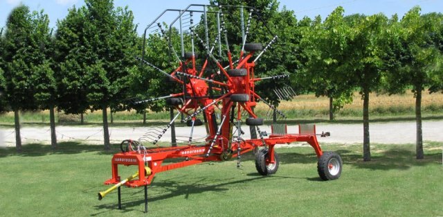 IDEAL FOR : large productions. KEY FEATURES : Machine for large productions, extreme work practicality and large adjustability to different forage conditions. DESCRIPTION : The double rotary rake DRAGONFLY is a semi-mounted machine that has four wheels axle tandem with excellent stability even on uneven grounds. All opening and closing movements of the machine and working width are hydraulic. The double rotary rake Dragonfly 7700 can easily work in large fields, reducing the processing time considerably. The windrows obtained are airy and full of their nutritive value. Rear steering wheels to guarantee maximum maneuverability. MODELS : Dragonfly 7700. |