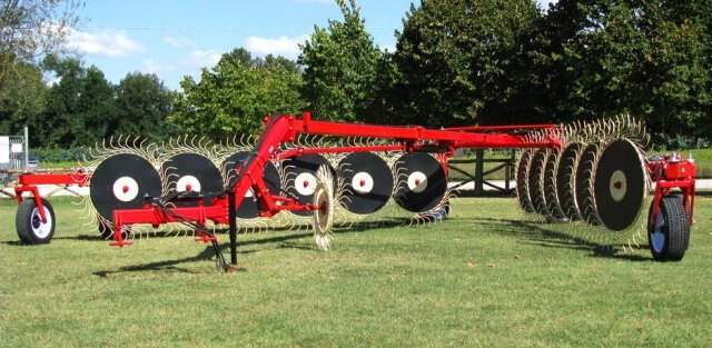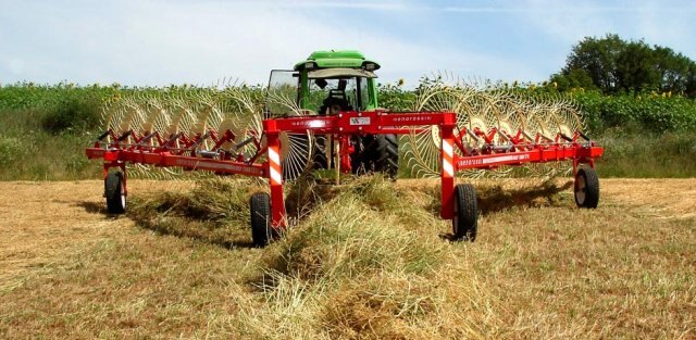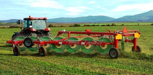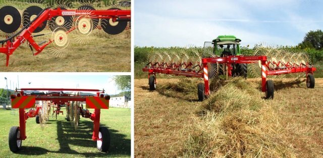 IDEAL FOR : working on all types of terrain. KEY FEATURES : The autosteer system allows the machines to work with ease in small plots and the shock absorbers ensure shock-free operations on uneven terrain. DESCRIPTION : T The Easy Rake pull type V rake has been designed with many technological innovations that are unique to the market and aimed at improving operator productivity. The two sides are independent from one another, allowing the V rake to operate just on one side. Simple swath adjustment is obtained by using bushings system. Heavy tubing that make up the rake’s main frames are the heaviest in the industry; built to hold up for years. The width of the windrow can be adjusted by moving the raking wheel arms to the various adjacent bush positions. The articulated frame and the independent raking wheels allow the V rake to adapt to the most varied working conditions. Possibility of inserting the hydraulic kicker wheel for moving the forage in the central zone. Centrally mounted pivoting points give the V rake the ability to “float” over uneven terrain without stressing the frame. Two central raking wheels with hydraulic lift device can be provided upon request. Raking wheel 140 cm. Ø with tooth 6,9 mm. Ø. Raking wheel 150 cm. Ø with tooth 7,5 mm. Ø upon request. The automatic hooking system allows making all operations without leaving the tractor seat. An innovative and ergonomic solution: Enoagricola Rossi was the first company to develop, build, and apply the auto-steering system to finger wheel rakes. The auto-steering system is a closed hydraulic system made up of hydraulic hoses and two cylinders, one situated on the two-point hitch of the rake and the other on the rear crossbar. This technical innovation enables the V rake to steer itself independently, following the path of the tractor, and thus do right-angle turns and maneuver easily in very tight spaces. The system will hydraulically pivot the rear wheels during turns to allow the operator to turn sharply in fields. Optional hydraulically controlled center double kicker wheel assembly and wind guards are also available. The system can be applied to both the Easy Rake and the Easy Rake Superstar V rakes. MODELS : Easy Rake and Easy rake autosteer model. |
