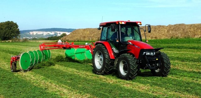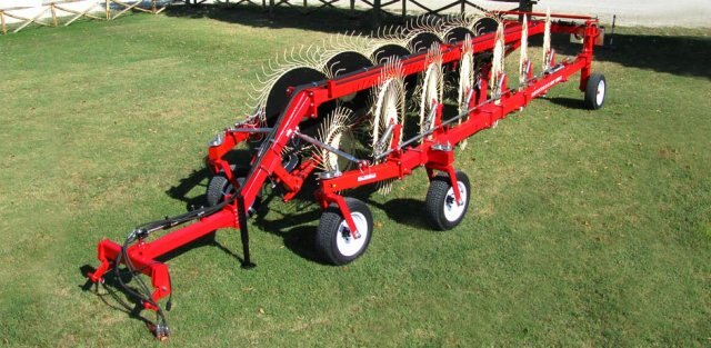 IDEAL FOR : working on all types of terrain. KEY FEATURES : The autosteer system allows the machines to work with ease in small plots and the shock absorbers ensure shock-free operations on uneven terrain. DESCRIPTION : T The Easy Rake pull type V rake has been designed with many technological innovations that are unique to the market and aimed at improving operator productivity. The two sides are independent from one another, allowing the V rake to operate just on one side. Simple swath adjustment is obtained by using bushings system. Heavy tubing that make up the rake’s main frames are the heaviest in the industry; built to hold up for years. The width of the windrow can be adjusted by moving the raking wheel arms to the various adjacent bush positions. The articulated frame and the independent raking wheels allow the V rake to adapt to the most varied working conditions. Possibility of inserting the hydraulic kicker wheel for moving the forage in the central zone. Centrally mounted pivoting points give the V rake the ability to “float” over uneven terrain without stressing the frame. Two central raking wheels with hydraulic lift device can be provided upon request. Raking wheel 140 cm. Ø with tooth 6,9 mm. Ø. Raking wheel 150 cm. Ø with tooth 7,5 mm. Ø upon request. The automatic hooking system allows making all operations without leaving the tractor seat. An innovative and ergonomic solution: Enoagricola Rossi was the first company to develop, build, and apply the auto-steering system to finger wheel rakes. The auto-steering system is a closed hydraulic system made up of hydraulic hoses and two cylinders, one situated on the two-point hitch of the rake and the other on the rear crossbar. This technical innovation enables the V rake to steer itself independently, following the path of the tractor, and thus do right-angle turns and maneuver easily in very tight spaces. The system will hydraulically pivot the rear wheels during turns to allow the operator to turn sharply in fields. Optional hydraulically controlled center double kicker wheel assembly and wind guards are also available. The system can be applied to both the Easy Rake and the Easy Rake Superstar V rakes. MODELS : Easy Rake and Easy rake autosteer model. |