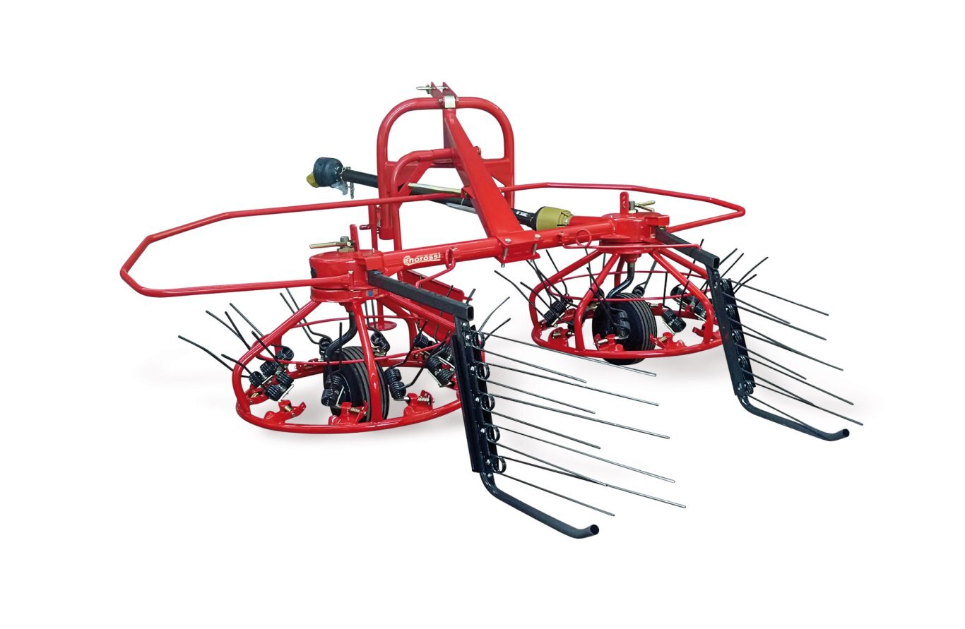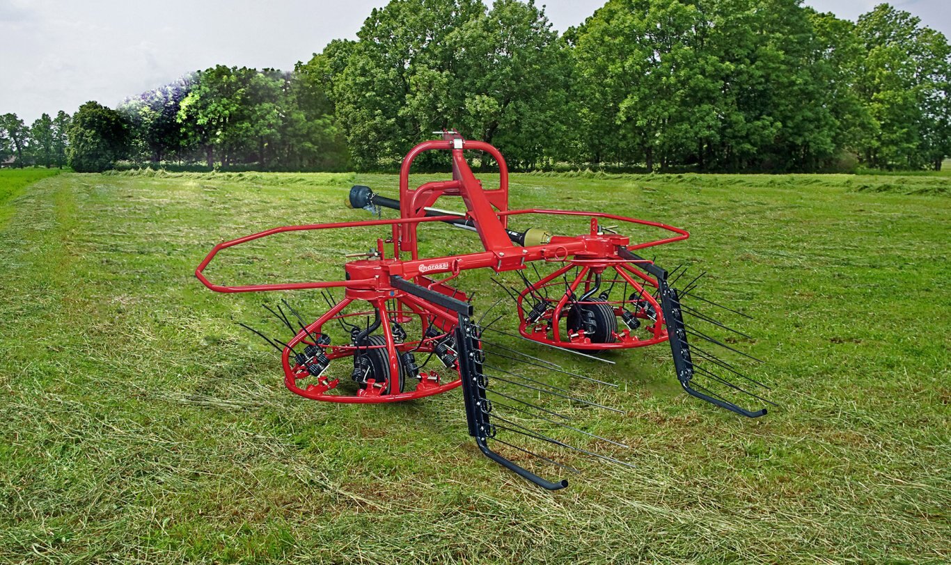 | The machine is multi-purpose; it performs 4 functions: spreading, overturning, and forming the central and lateral swath. The adjustments to pass from a fuction to another are simple and quick. The DR 420 4R rake adapts to any working conditions even the most extreme. The working width can be adjusted by sliding the main frame from a minimum of 3.70 m to a maximum of 4.20 m. |