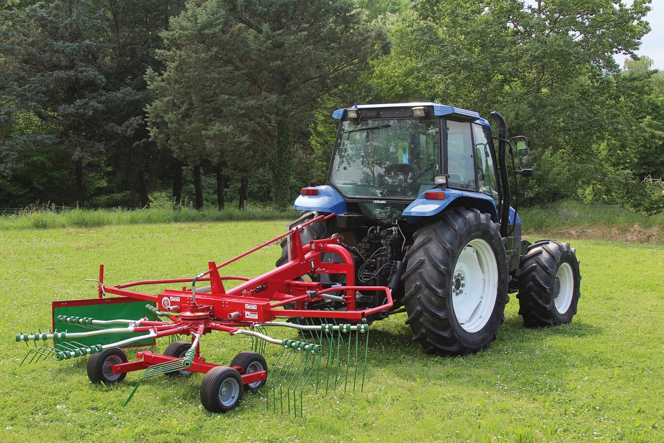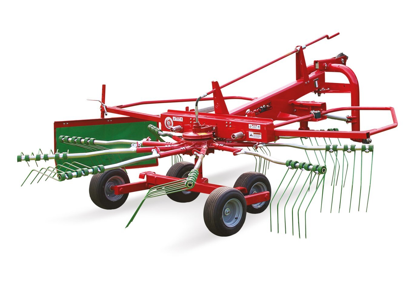 | The rotary rake RR 350-EVO 3 point version mounts spaced wheels on a tandem axle for greater stability. It is equipped with an articulated 3 point hitch with lateral oscillation and a locking pin for transport. The frame is equipped with lateral shock absorbers increasing the work efficiency. The arms are reinforced. |