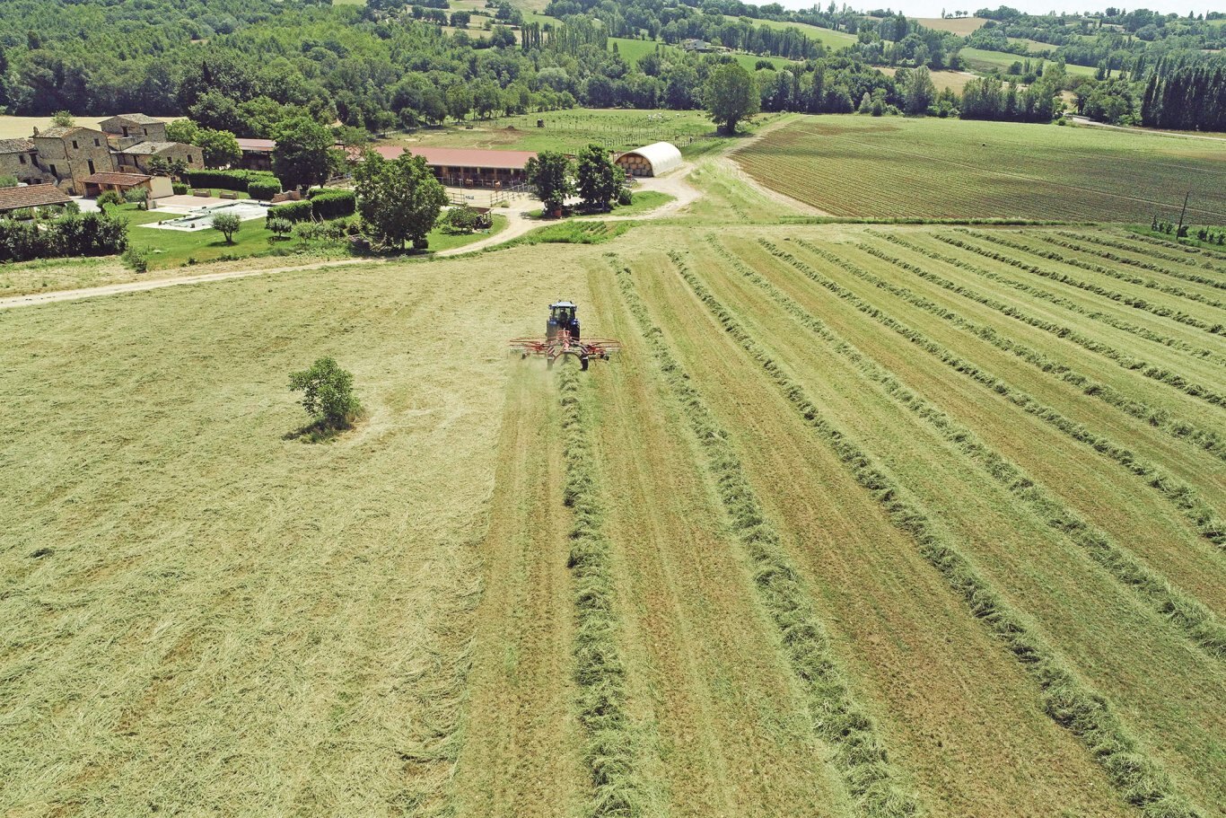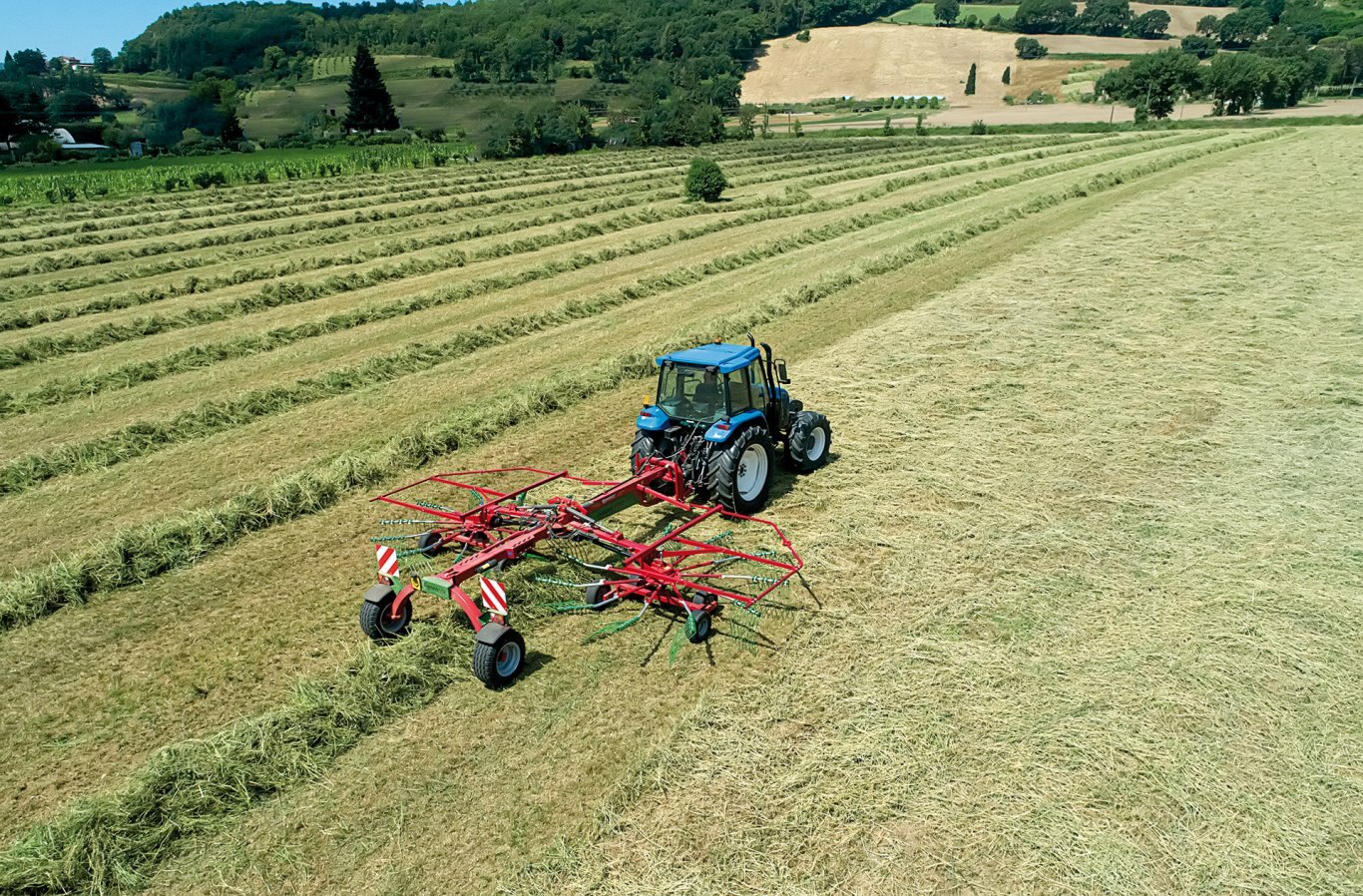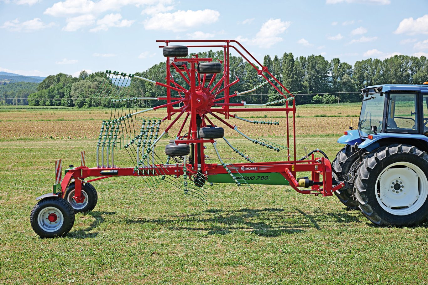 The ENODUO 780 model double rotor rake forms a central swath. The attachment to the tractor is pivoting semi-trailed. Hydraulically variable working width. The rotors are oscillating for a better adaptation to the ground. Thanks to the overlapping of the raking arms, even the product in the center is raised from the ground, facilitating drying.