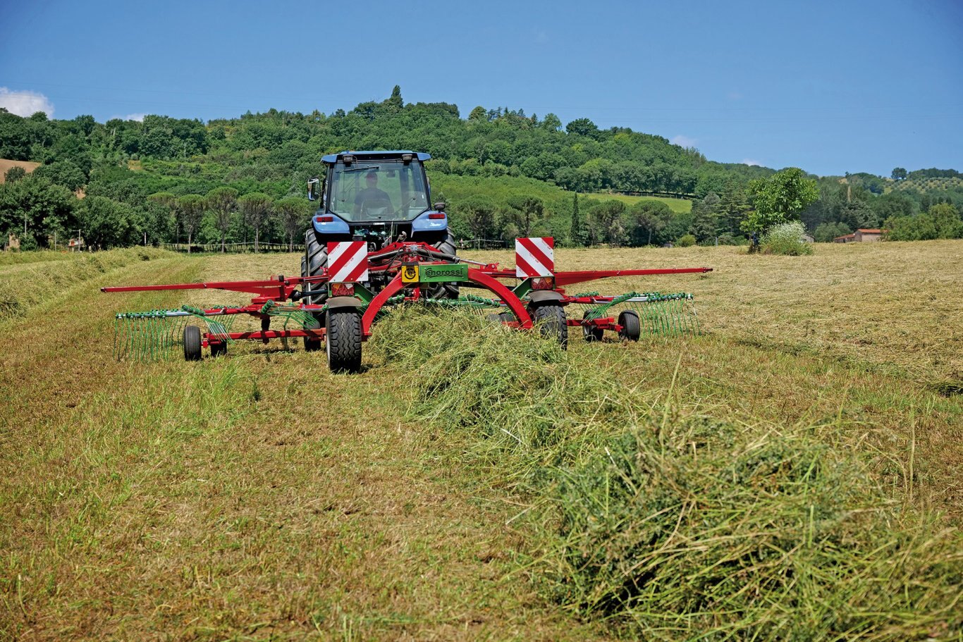 Windrow delivery: Central Rotor transmission: Oil bath Working depth control Mechanical Rotors Arms: Overlapping Working width adjustment Hydraulic Drawbar hitch 2 point hitch Transmission with cardan shafts Lights and road signaling kit