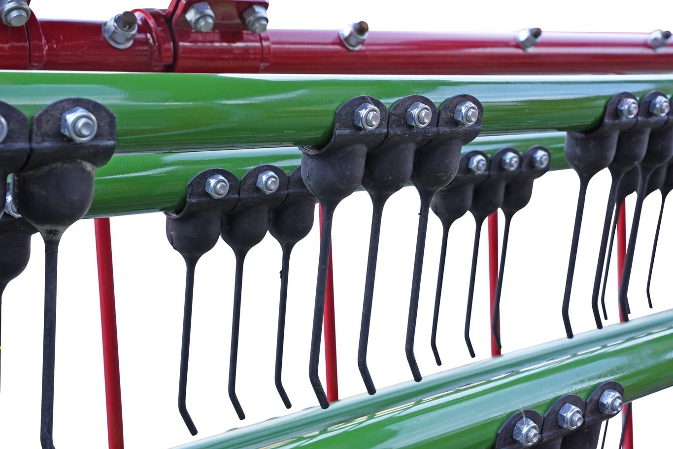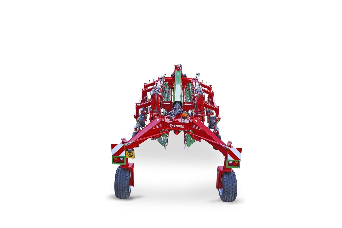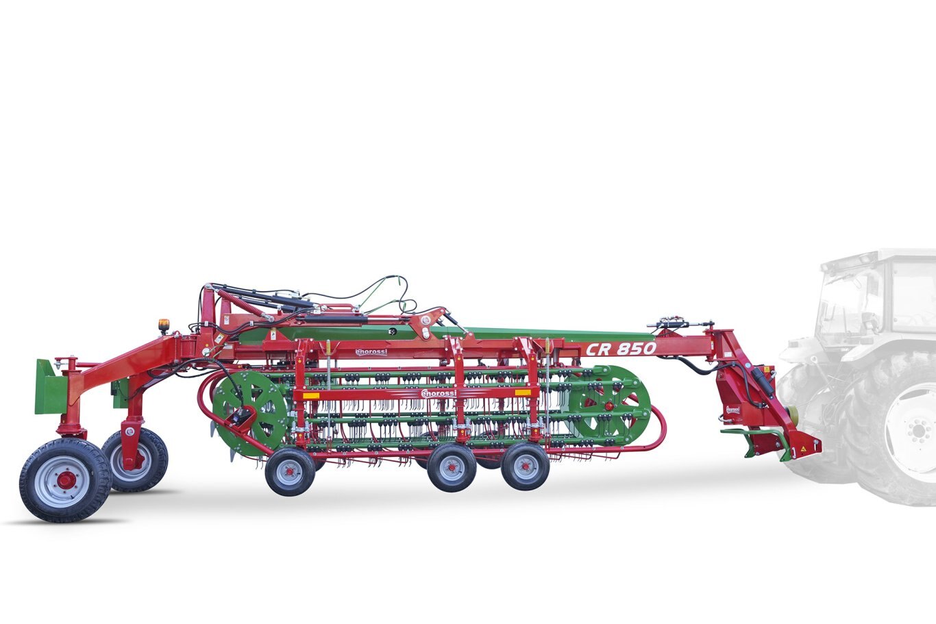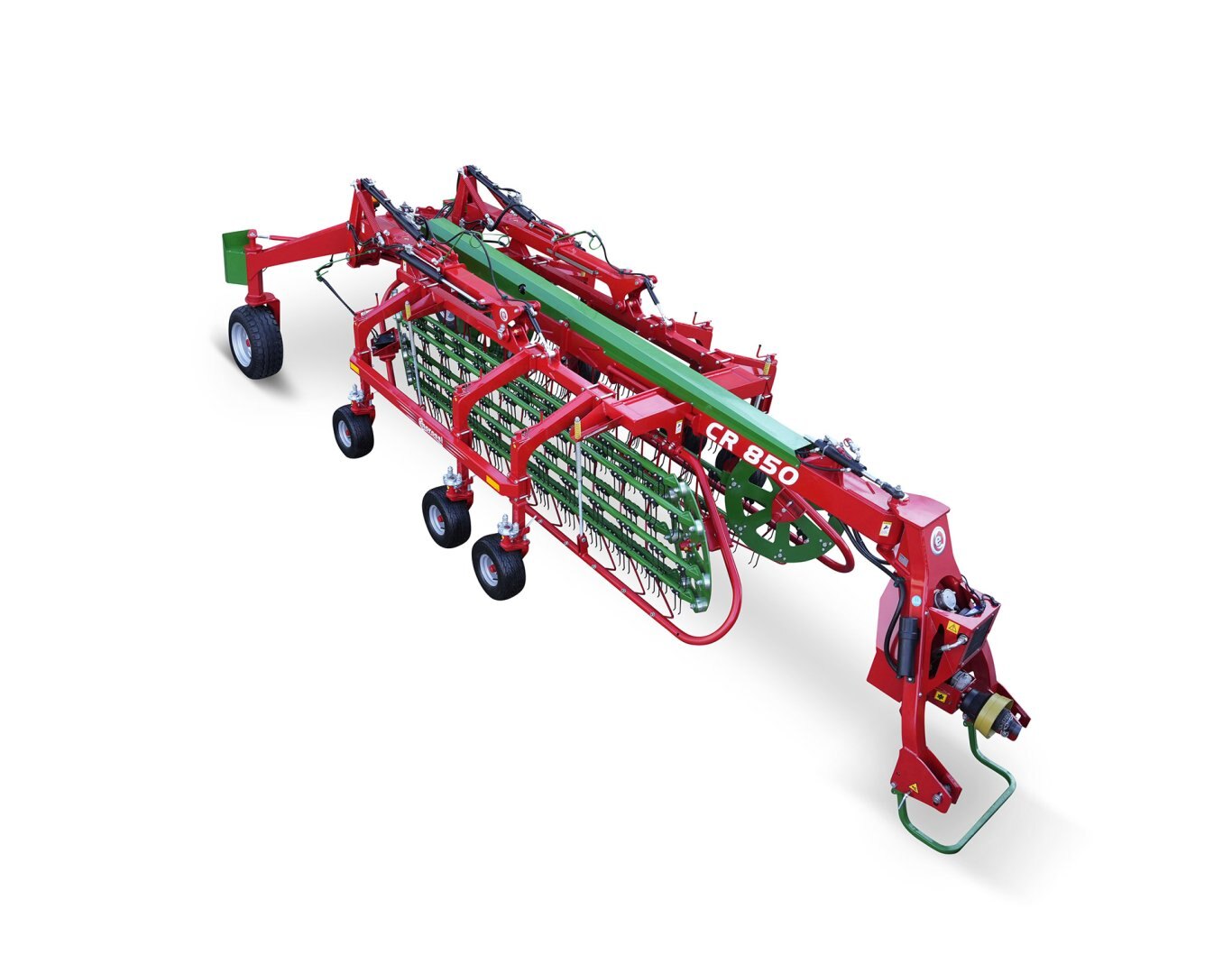 The CR 850 basket bar rake has been designed to harvest the best possible quality forage. The multiple tines ensure the collection of the product, forming a soft swath completely free of impurities; the seven-bars maximize performance even in conditions of high forage volumes. The self-steering system is hydraulic and standard for maximum manoeuvrability, transport is quick and easy thanks to the transport width of only 2.8 meters.