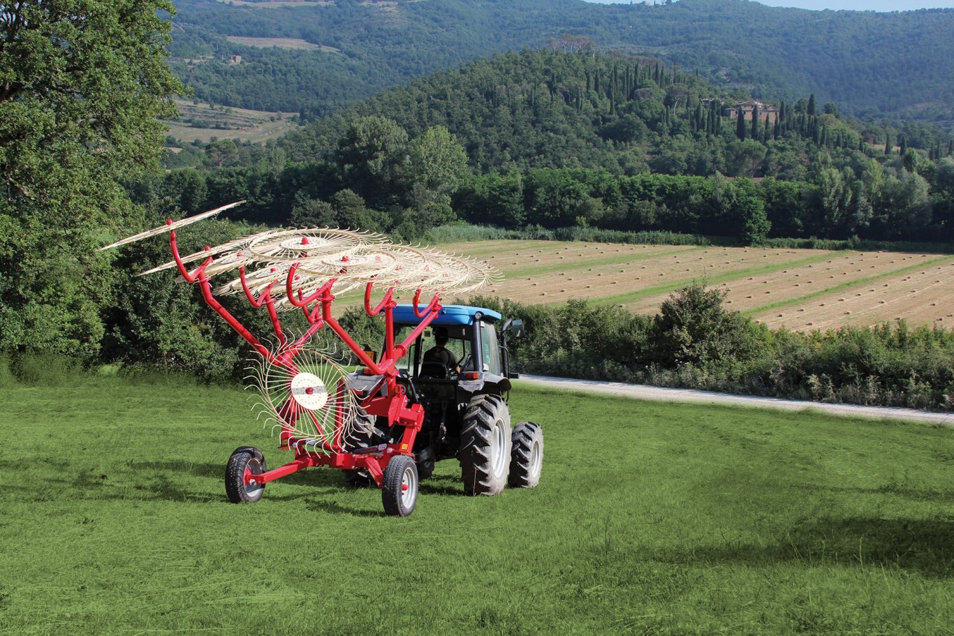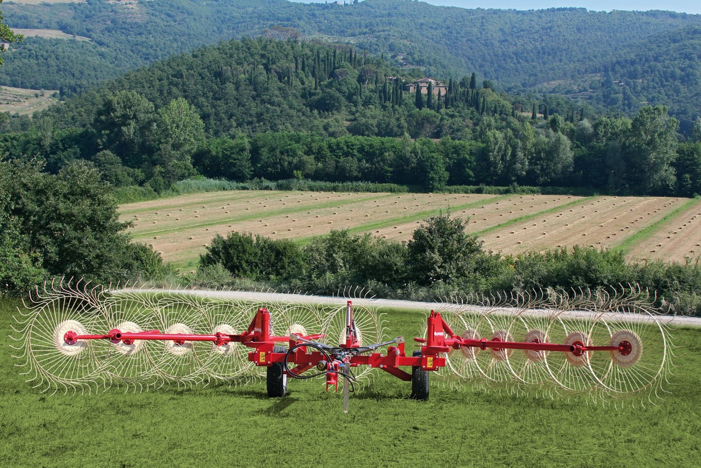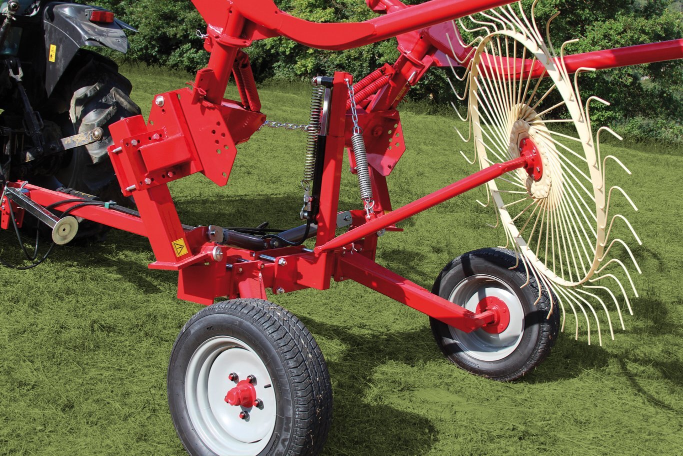 | The CADDY wheel rake is ideal for small extensions. It forms a central windrow whose width is mechanically adjustable. The wide wheelbase makes the machine stable during work and transport. |
