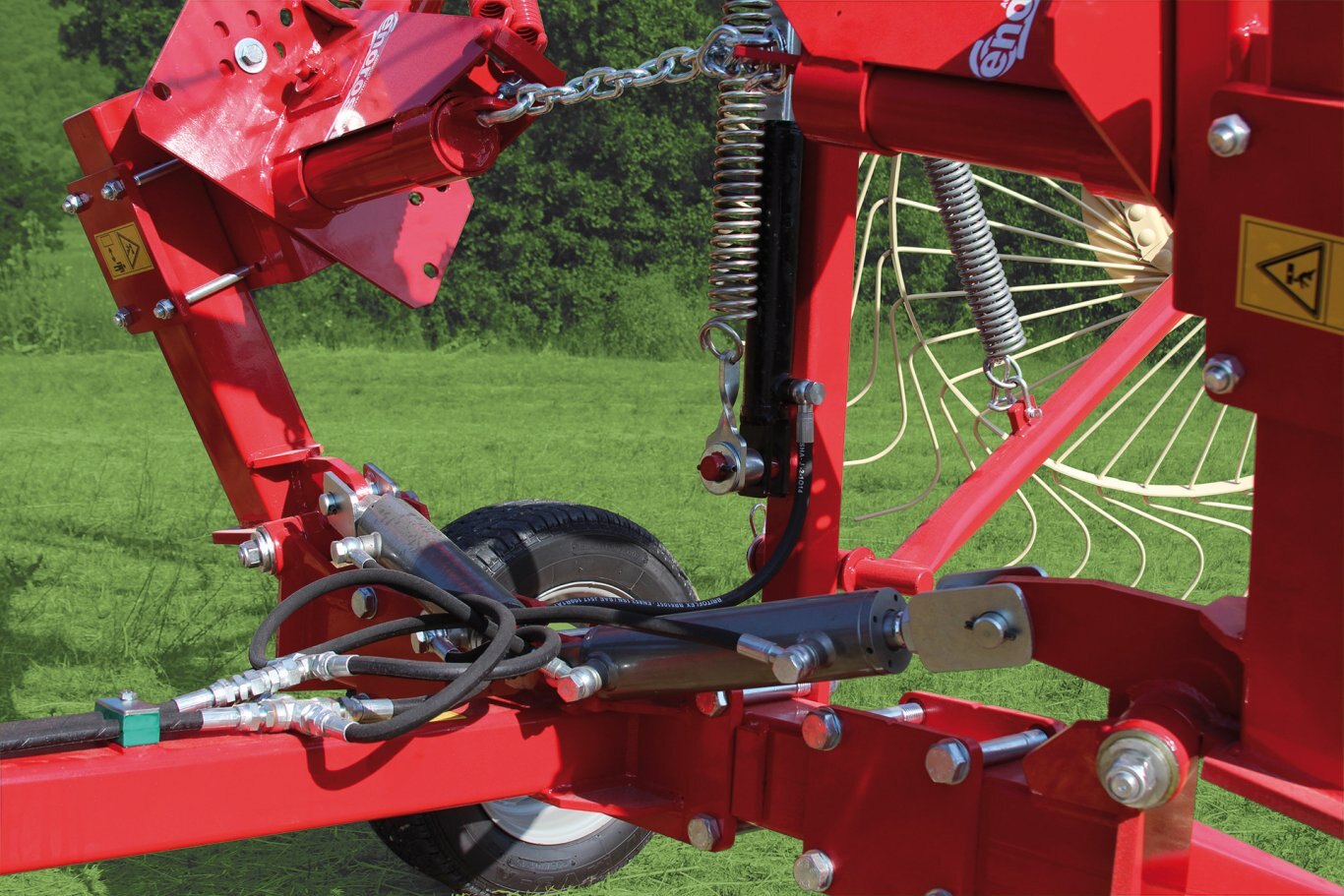 The adaptation of the rake wheels to the ground is very important, especially in conditions of disconnected terrain, therefore each model of rake has its own adjustment system. |