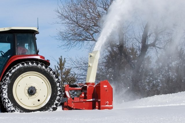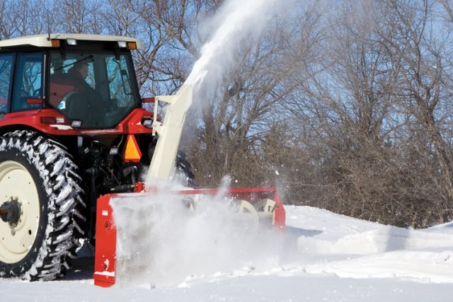 PTO-driven Farm King snowblowers attach to 3-point hitch and are available in widths ranging from 50" to 120".