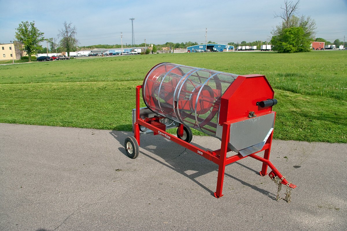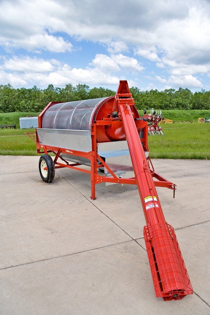 Cleans up to 1000 bushels per hour. The screenings are discharged onto the ground while cleaned grain is distributed through a built-in chute for convenient loading. The pulleys and adjustable mounts and are designed to fit most 1 hp motors. An optional 6" intake auger for easy loading.