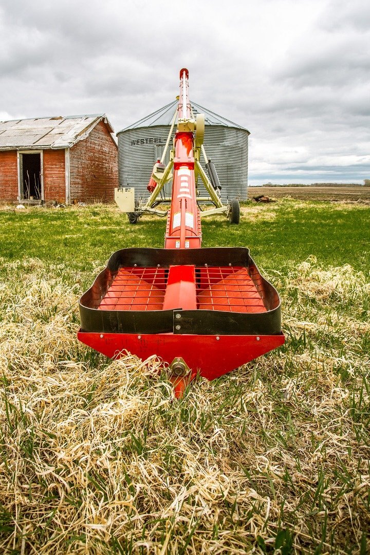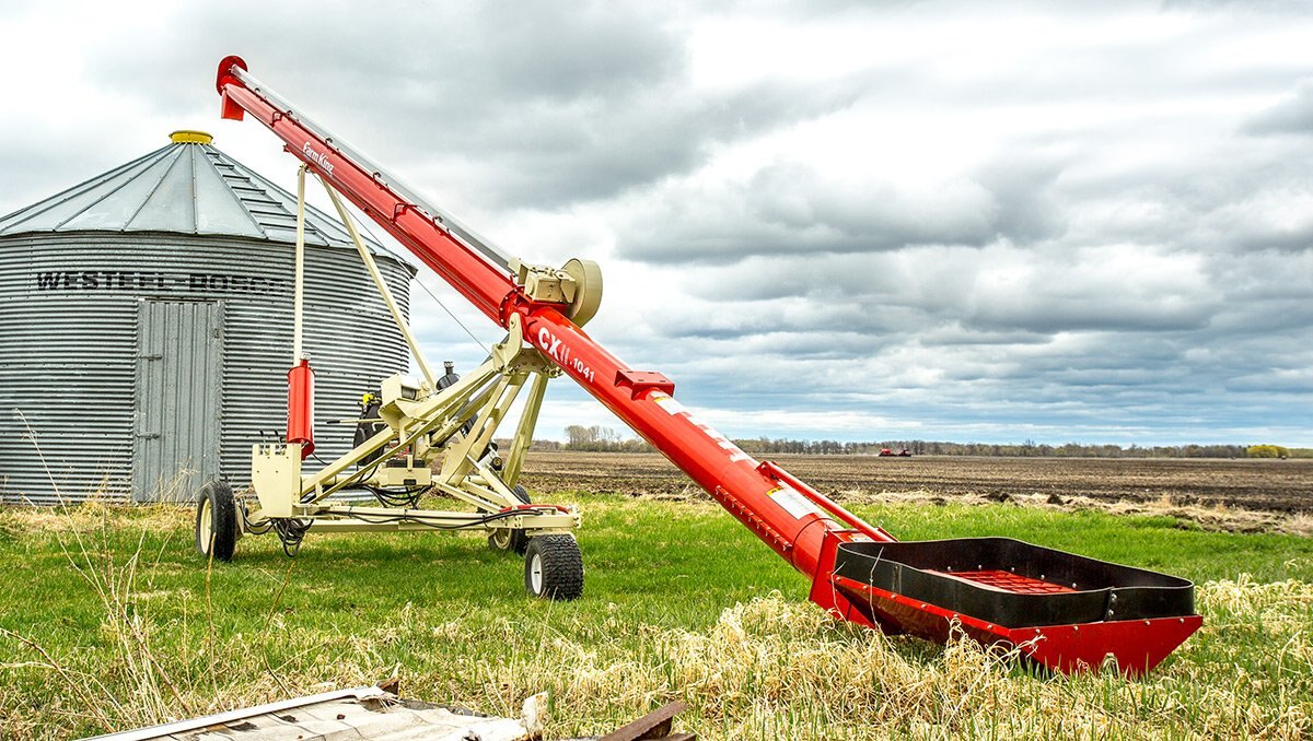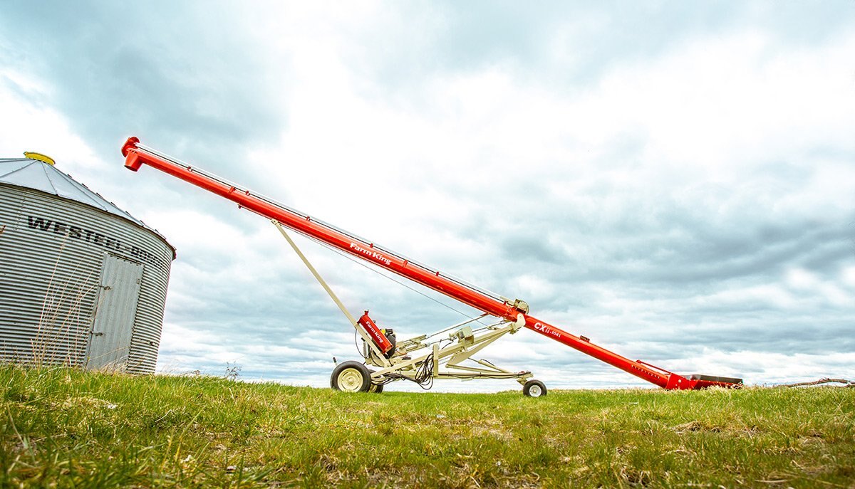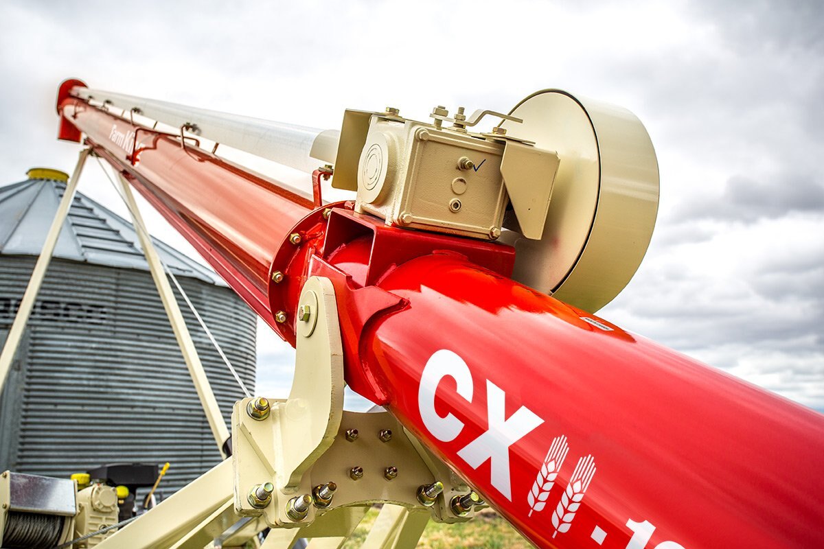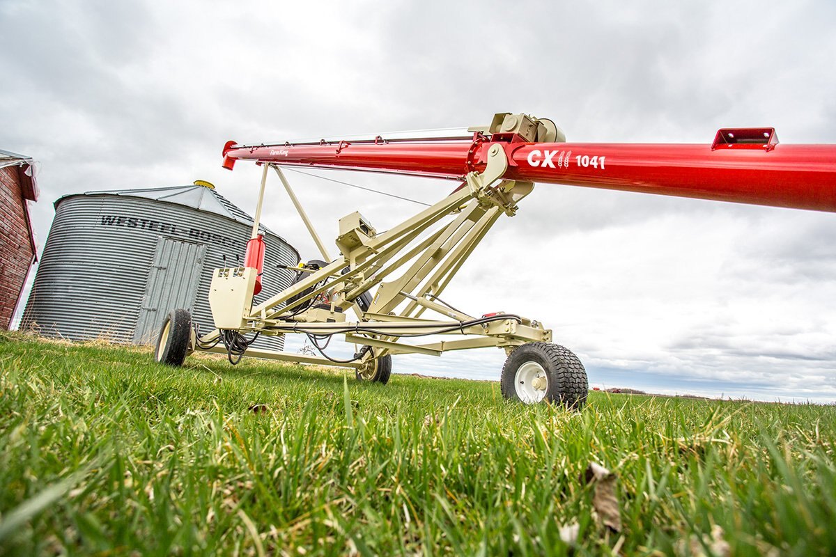 The intake end of the auger flighting is supported by a wooden, self lubricating bushing, which is highly resistant to dirt contamination and is maintenance free. A narrow safety guard and removable clevis hitch improve access to bins with small auger ports.