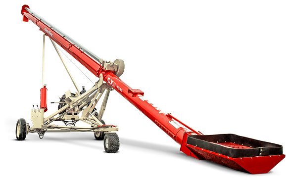 The sturdy lightweight assembly allows the conventional auger to be easily transported. The trailing swivel wheels can be raised hydraulically to allow for increased turning radius as well as smooth transitions over uneven terrain.