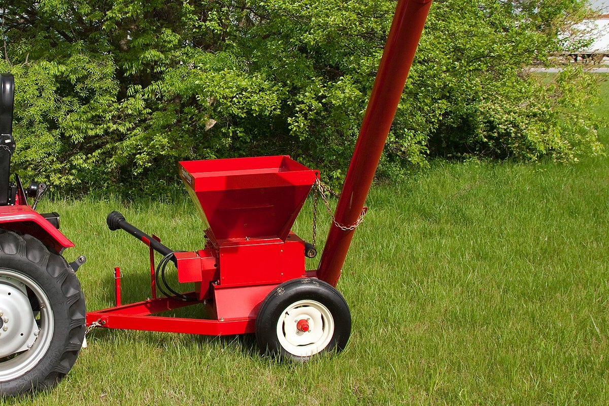 Machine-grooved rollers are available in steel or chrome and can be inexpensively re-machined up to three times if damaged or worn. An optional magnet removes nails and other metal objects from the grain and helps prevent damage to the rollers. An electric motor or PTO drives the 85 and 100. The 180 is PTO driven and can be equipped with 15" wheels to help with transport and a 12' hydraulic discharge auger that swings a full 180 degrees.